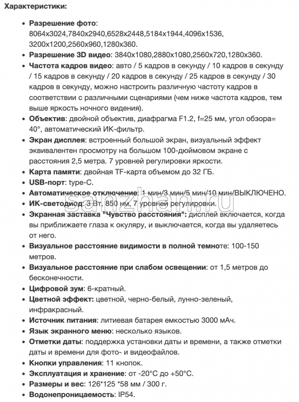 Разрешение фото: 8064x3024,7840x2940,6528x2448,5184x1944,4096x1536, 3200x1200,2560x960,1280x360. Разрешение 3D видео: 3840x1080,2880x1080,2560x720,1280x360. USB-порт: type-C. Автоматическое отключение: 1 мин/3 мин/5 мин/10 мин/ВЫКЛЮЧЕНО. ИК-светодиод: 3 Вт, 850 нм, 7 уровней регулировки. Визуальное расстояние видимости в полной темноте: 100-150 метров. Визуальное расстояние при слабом освещении: от 1,5 метров до бесконечности. Цифровой зум: 6-кратный. Цветной эффект: цветной, черно-белый, лунно-зеленый, инфракрасный. Источник питания: литиевая батарея емкостью 3600 мАч. Язык экранного меню: несколько языков. Отметки даты: поддержка установки даты и времени, а также отметки даты и времени для фото- и видеофайлов. Кнопки управления: 11 кнопок. Эксплуатация и хранение: от -20°C до +50°C. Размеры и вес: 126*125 *58 мм / 300 г. Водонепроницаемость: IP54.
